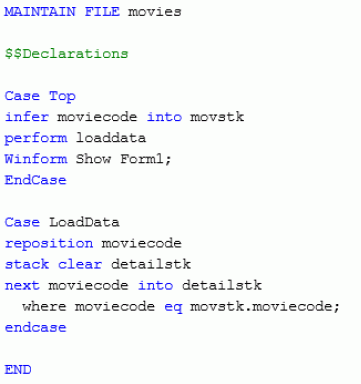 The following is a sample drilldown from a report against the MOVIES data source to a Maintain procedure. It passes the value from the first report column (N1) to the Moviecode field in the Movstk stack in the the LoadData case of the Maintain procedure named Request2.