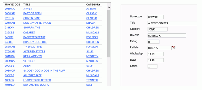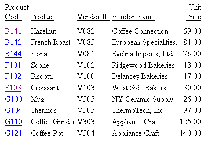 When the report and the Maintain form are placed on the same HTML page, clicking one of the links in the report passes the values to the Maintain form, as shown in the following image.
