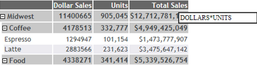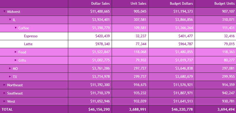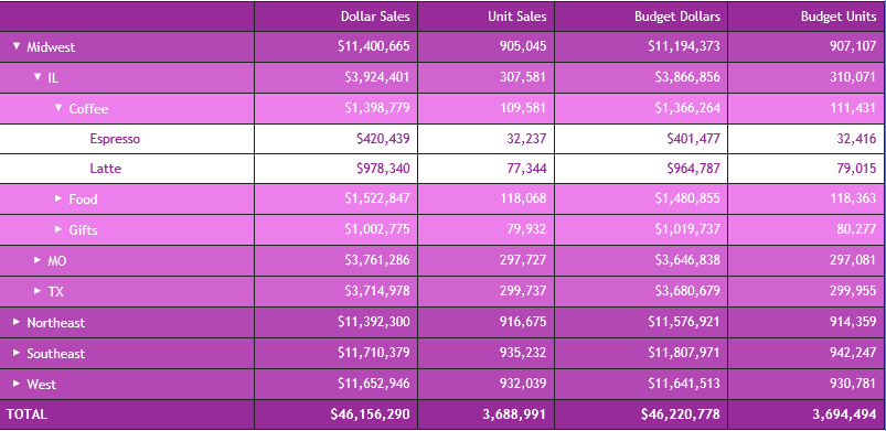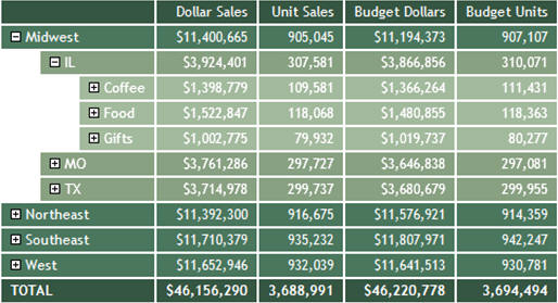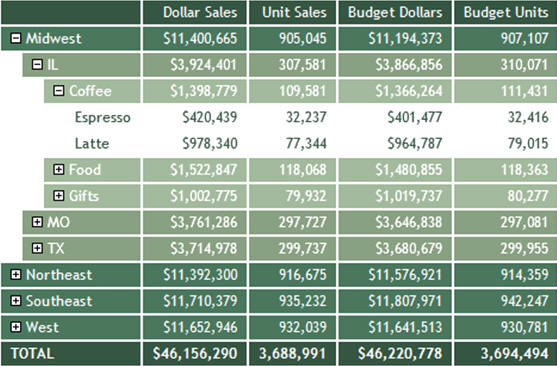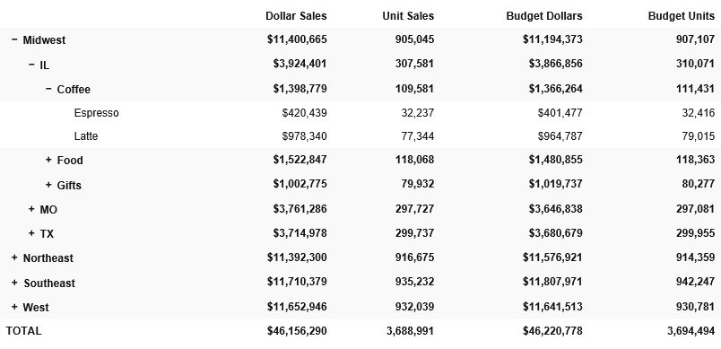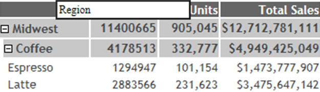 Clicking the plus sign (+) next to the Coffee category shows the products associated with that category, as shown in the following image. This is the lowest level of the Accordion By Row report.