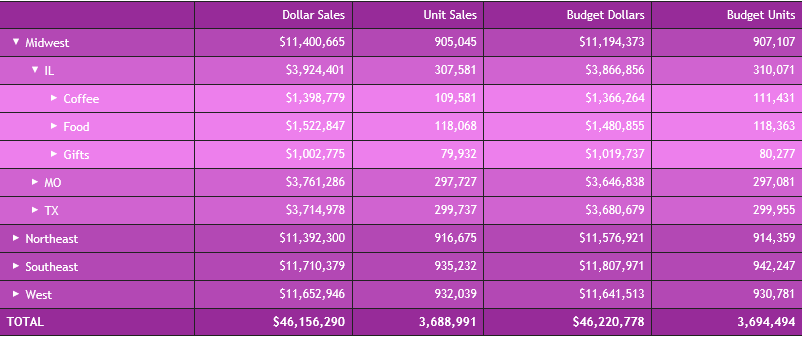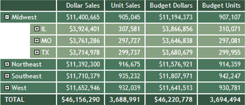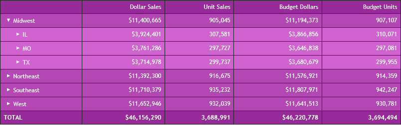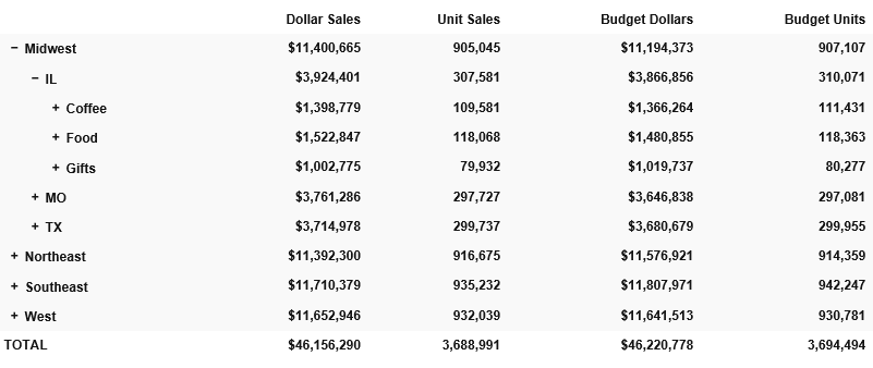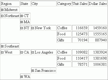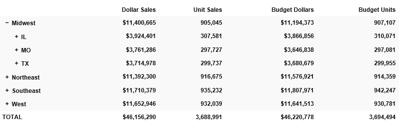 Clicking the plus sign (+) next to the Midwest region opens the rows that show the states associated with that region, as shown in the following image.