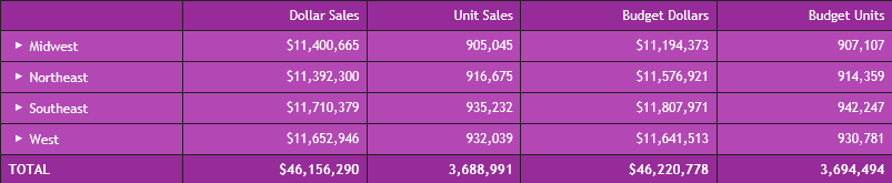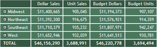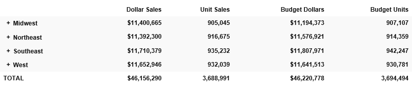 The following image shows an Accordion by Column Report which displays all data associated with the first-level sort field, Region, by default. The expanded data values you see are the result of a report user clicking plus signs to the left of specific first, second- and third-level sort fields after the report is generated.