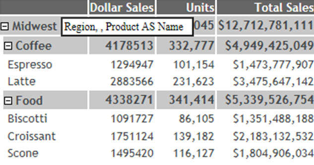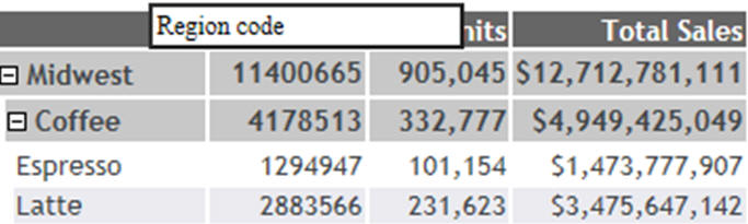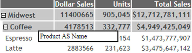 The following image shows the pop-up text that will display when the mouse hovers over any of the top level BY values that do not have an AS name, but do have a defined description and title. In this case, the column titles will display.