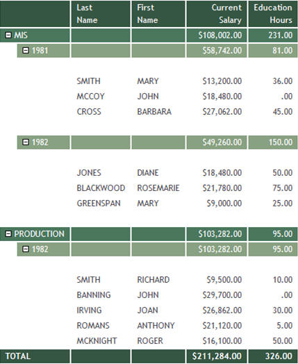 Accordion By Column reports do not automatically display entire report rows. A plus sign appears to the left of each data value in the column under the highest-level sort heading. For data associated with lower-level sort fields, a plus sign is placed to the left of each data value, but the data does not appear unless manually expanded. Data values of the lowest-level sort field are not expandable. To expand your view of data for any expandable sort field, click a plus sign and all data associated with the next lower-level sort field appears. When you expand a data value under the next to lowest sort heading, all of the remaining associated data values in the report appear. This type of Accordion Report is generated using the SET EXPANDABLE command.
