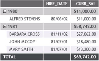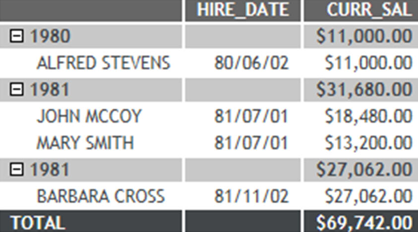 In the above request, the verb fields, HIRE_DATE and CURR_SAL are sorted by the DEFINE field, DATE_HIRED. The result is a report sorted and aggregated by the redefined date values, as shown in the following image.