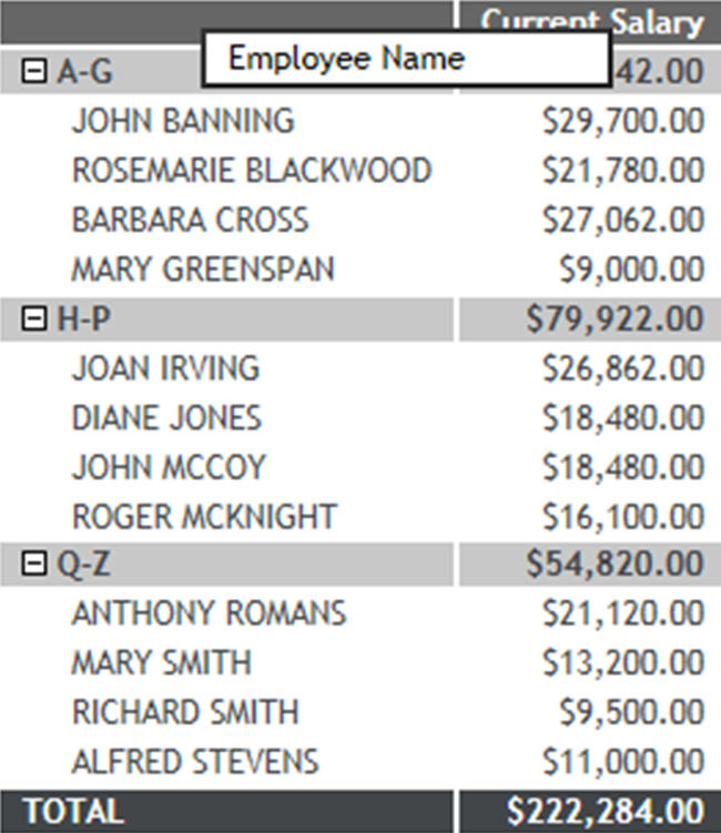 The following request against the EMPLOYEE data source shows salary data for employees, grouped in categories. The output is sorted by the virtual field NAME_SORT, which concatenates the LAST_NAME and FIRST_NAME fields. The NAME_SORT field is hidden using NOPRINT on the sort phrase. To display employee names, the NAME_DISPLAY virtual field is created, which concatenates the FIRST_NAME field and the LAST_NAME field.