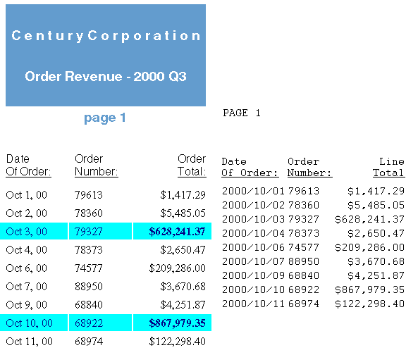 The following pair of reports shows order number, order date, and total order revenue for Century Corporation in the third quarter of 2000. Compare the formatted version (on the left) with the unformatted version (on the right):