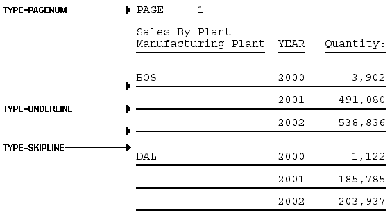 The following code and output examples illustrate where the PAGENUM, UNDERLINE, and SKIPLINE components appear in a report, and which TYPE values you use to identify them.