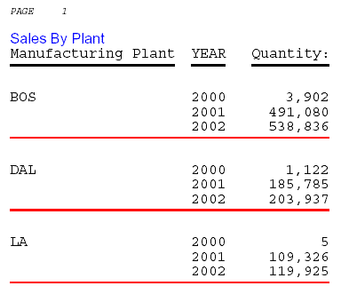 SET ONLINE-FMT=PDF TABLE FILE CENTORD HEADING "Sales By Plant" SUM QUANTITY BY PLANT BY YEAR WHERE PLANT EQ 'BOS' OR 'DAL' ON YEAR UNDER-LINE ON PLANT SKIP-LINE END