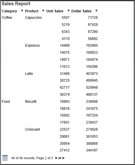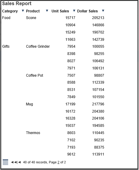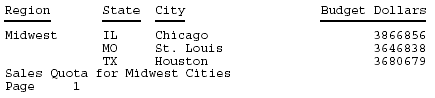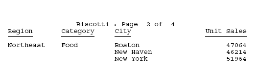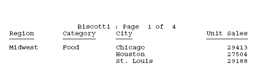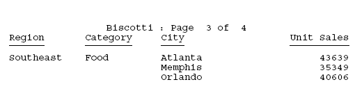 The following request against the GGSALES data source sorts by product, region, category, and city. It resets the pagination each time the product changes. The heading prints the current page number and the total within each product group.
