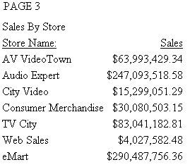 SET FOCFIRSTPAGE = 3 TABLE FILE CENTORD HEADING "Sales By Store" SUM LINEPRICE AS 'Sales' BY SNAME WHERE SNAME EQ 'eMart' ON TABLE SET STYLE * TYPE=REPORT, GRID=OFF, $ ENDSTYLE END -RUN