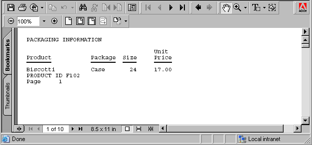 The following partial output shows that the page number resets to 1 when the product changes and that the BYLASTPAGE variable displays the total number of pages for each product: