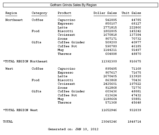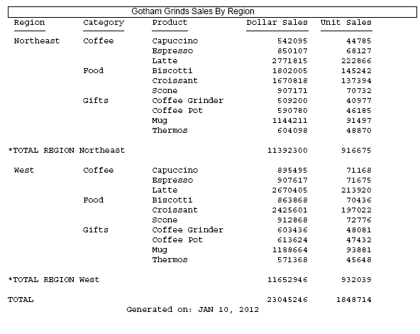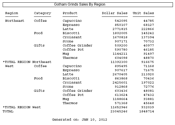 The following request against the GGSALES data source has a heading, a footing, and a subtotal. Initially, DROPBLNKLINE is set to OFF.