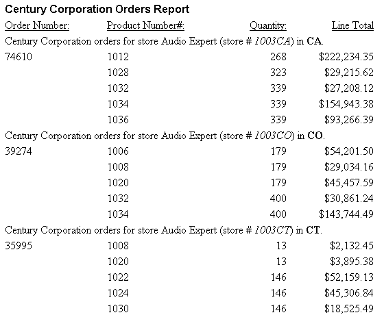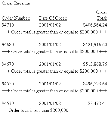 This report lists orders, order dates, and order totals for the Century Corporation. It uses conditional sort footings to distinguish between orders that total more than $200,000 and less than $200,000.