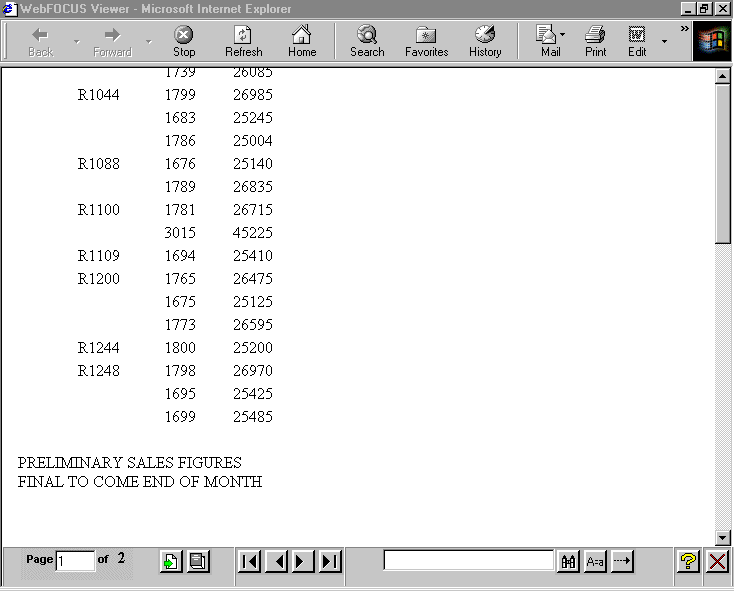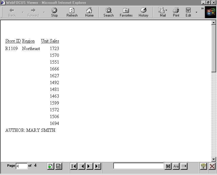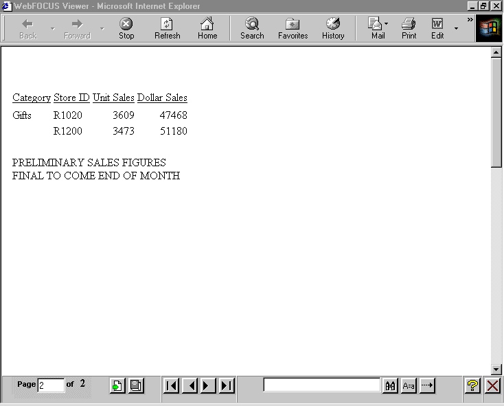 END The output illustrates the placement of a report footing on a multi-page HTML report. The report footing follows the data on the last page.