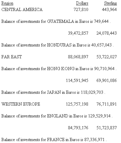 TABLE FILE SHORT SUM BALANCE AS 'Dollars' ENGLAND_POUND AS 'Sterling' BY REGION WHERE REGION EQ 'FAR EAST' OR 'CENTRAL AMERICA' OR 'WESTERN EUROPE'; BY COUNTRY NOPRINT RECAP EURO/D16=BALANCE * 1.03; SUBFOOT " " "Balance of investments for <COUNTRY> in Euros is <EURO>." " " END