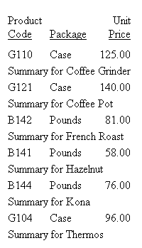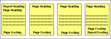 The following sample report contains a report heading at the beginning of the report and a report footing at the end of the report. It also contains a page heading and page footing on every page of the report.