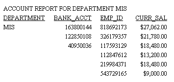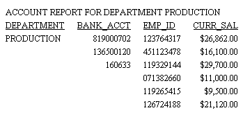 Add a page heading to identify and reinforce the report content and purpose from page to page, or include a variable that customizes the heading on each page. For example, consider a report with employee bank account information, arranged by department. Information for each department appears on a separate page. The page heading for this report identifies the department addressed on each page (for example, ACCOUNT REPORT FOR PRODUCTION DEPARTMENT).