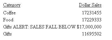 END Sales for the category Gifts fall below the specified amount, as the sort heading warns. No other category is preceded by a sort heading.