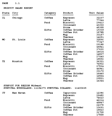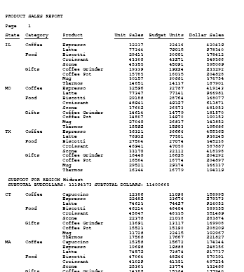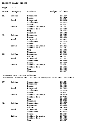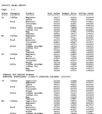 TABLE FILE GGSALES HEADING "PRODUCT SALES REPORT" "" "Page<TABPAGENO" "" SUM UNITS BUDUNITS DOLLARS BUDDOLLARS BY REGION NOPRINT BY ST BY CATEGORY BY PRODUCT ON REGION SUBFOOT " " " SUBFOOT FOR REGION <REGION " " SUBTOTAL BUDDOLLARS: <ST.BUDDOLLARS SUBTOTAL DOLLARS: <ST.DOLLARS " " " ON TABLE SET BYPANEL ON ON TABLE SET PAGE ON ON TABLE PCHOLD FORMAT PDF ON TABLE SET STYLE * TYPE=REPORT, GRID=OFF, $ TYPE = REPORT, HEADPANEL=OFF,$ ENDSTYLE END