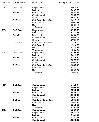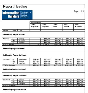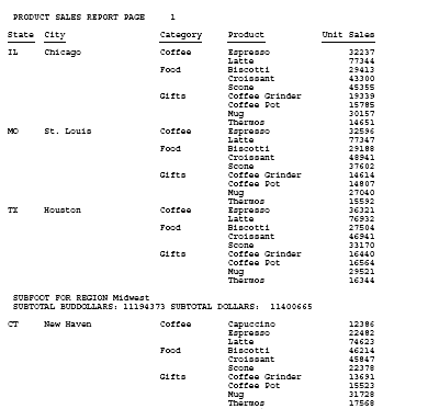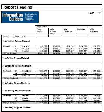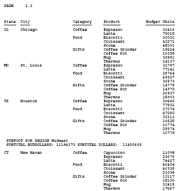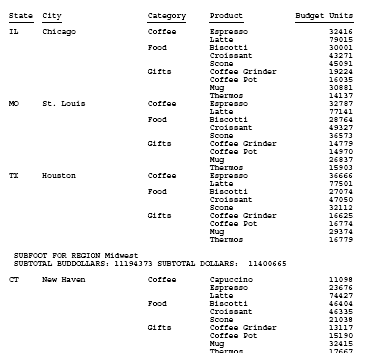 TABLE FILE GGSALES HEADING " PRODUCT SALES REPORT" " " SUM UNITS BUDUNITS DOLLARS BUDDOLLARS BY REGION NOPRINT BY ST BY CITY BY CATEGORY BY PRODUCT ON REGION SUBFOOT " " " SUBFOOT FOR REGION <REGION " " SUBTOTAL BUDDOLLARS: <ST.BUDDOLLARS SUBTOTAL DOLLARS: <ST.DOLLARS " " " ON TABLE SET BYPANEL ON ON TABLE SET PAGE ON ON TABLE PCHOLD FORMAT PDF ON TABLE SET STYLE * TYPE = SUBFOOT, HEADPANEL=ON,$ ENDSTYLE END