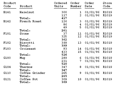 This request creates an HTML report using HEADALIGN = BODY to align the two elements of the sort footing (TOTAL IS and the value) with each of the two data columns (Product and Ordered Units). JUSTIFY = RIGHT, which applies to the entire sort footing, right justifies each sort footing element under the data column.