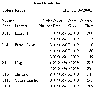 The spot markers in the third line of the heading split it into three text elements: Orders Report, blank, Run on: &DATE. In the output, each element appears in a cell in the third row of the embedded HTML table, in the order specified in the request.
