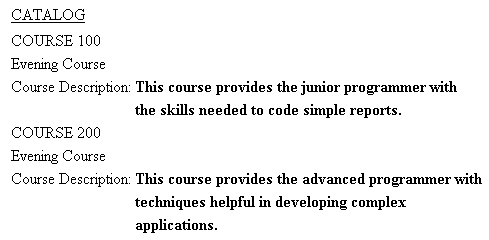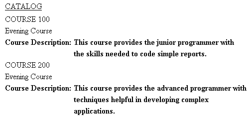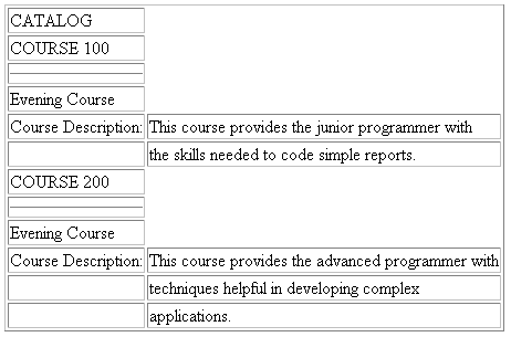 The request uses HEADALIGN=BODY to align the text field lines in a sort footing. With this setting, each element in the footing is aligned with a column in the main HTML table generated for the report: the first element (the text Course Description:) is aligned with the first data column, CATALOG. The embedded field is aligned in a second column. The grid is turned on in this example to make the alignment easier to see.