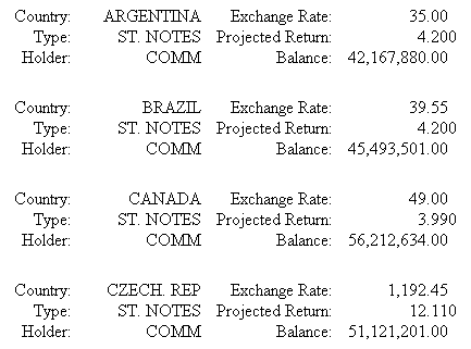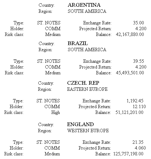 DEFINE FILE SHORT BALANCE/D14.2=BALANCE; END TABLE FILE SHORT BY COUNTRY NOPRINT SUBHEAD "Country:<COUNTRY Exchange Rate:<EXCHANGE_RATE" "Type:<TYPE Projected Return:<PROJECTED_RETURN" "Holder:<HOLDER Balance:<BALANCE" ON TABLE SET PAGE-NUM OFF ON TABLE SET ONLINE-FMT HTML ON TABLE SET HTMLCSS ON ON TABLE SET STYLESHEET * TYPE=REPORT, FONT='TIMES', $ TYPE=REPORT, GRID=OFF, $ TYPE=SUBHEAD, ITEM=1, WIDTH=1.00, JUSTIFY=RIGHT, $ TYPE=SUBHEAD, ITEM=2, WIDTH=1.25, JUSTIFY=RIGHT, $ TYPE=SUBHEAD, ITEM=3, WIDTH=1.25, JUSTIFY=RIGHT,$ TYPE=SUBHEAD, ITEM=4, WIDTH=1.5, JUSTIFY=DECIMAL(.6),$ ENDSTYLE END