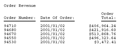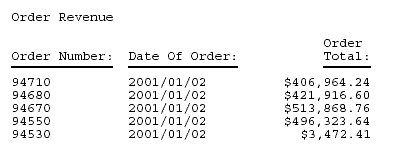 TABLE FILE CENTORD SUM ORDER_DATE LINEPRICE AS 'Order,Total:' BY HIGHEST 5 ORDER_NUM ON TABLE PAGE-BREAK AND SUBHEAD "CONFIDENTIAL COMPANY INFORMATION" "March 2003" HEADING "Order Revenue" " " ON TABLE SET PAGE-NUM OFF ON TABLE SET ONLINE-FMT PDF END