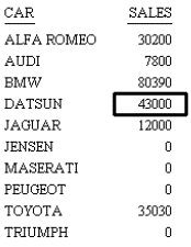 TABLE FILE CAR SUM SALES BY CAR ON TABLE SET STYLE * ON TABLE PCHOLD FORMAT PDF TYPE=DATA, COLUMN=SALES, GRID=HEAVY, WHEN=CAR EQ 'DATSUN', $ ENDSTYLE END
