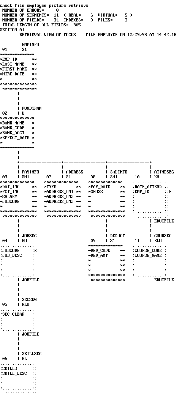 When using display commands, it is important to understand the structure of the data source and the relationship between segments, since these factors affect your results. You can use the CHECK command PICTURE option to display a diagram of the data source structure defined by the Master File.