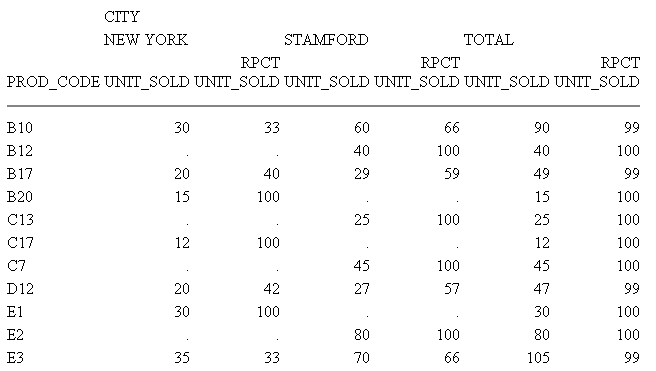Computes a field percentage based on the total values for the field. The PCT operator can be used with detail as well as summary fields.