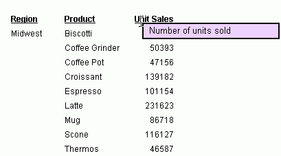 The following image shows the report output and the pop-up field description text that displays when your mouse pointer is positioned over the Unit Sales column title.