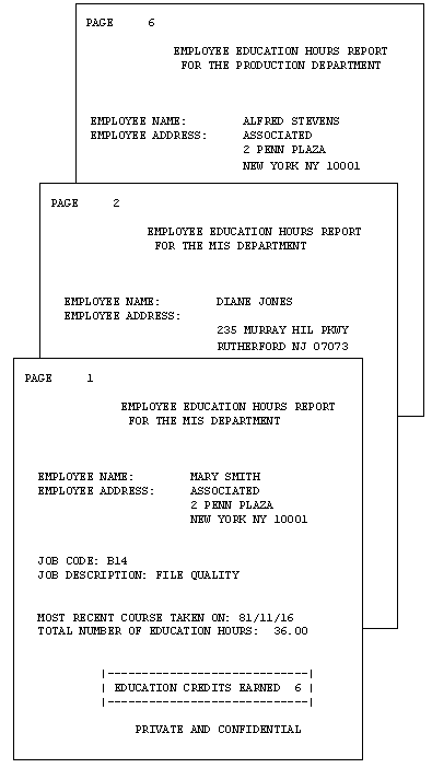 1. SET STYLE = OFF SET STYLEMODE=FIXED SET ONLINE-FMT = PDF 2. DEFINE FILE EMPLOYEE CR_EARNED/I2 = IF ED_HRS GE 50 THEN 9 ELSE IF ED_HRS GE 30 THEN 6 ELSE 3; END 3. TABLE FILE EMPLOYEE BY DEPARTMENT 4. HEADING " " "<13>EMPLOYEE EDUCATION HOURS REPORT" 5. "<14>FOR THE <DEPARTMENT DEPARTMENT" 6. "</2" "EMPLOYEE NAME: <23><FIRST_NAME <LAST_NAME>" "EMPLOYEE ADDRESS: <23><ADDRESS_LN1>" "<23><ADDRESS_LN2>" "<23><ADDRESS_LN3>" "</1" "JOB CODE: <JOBCODE>" "JOB DESCRIPTION: <JOB_DESC>" "</1" 7. "MOST RECENT COURSE TAKEN ON: <MAX.DATE_ATTEND>" "TOTAL NUMBER OF EDUCATION HOURS: <ED_HRS>" "</1" 8. "<10>|-------------------------------------|" 9. "<10>| EDUCATION CREDITS EARNED <CR_EARNED>|" "<10>|-------------------------------------|" 10.BY EMP_ID NOPRINT PAGE-BREAK 11.WHERE ED_HRS GT 0 12.FOOTING "<15>PRIVATE AND CONFIDENTIAL" END