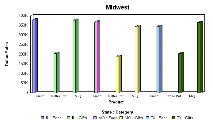 GRAPH FILE GGSALES SUM DOLLARS BY REGION BY ST BY CATEGORY BY PRODUCT WHERE CATEGORY EQ 'Food' OR 'Gifts' WHERE PRODUCT EQ 'Coffee Pot' OR 'Biscotti' OR 'Mug' ON GRAPH SET GRMERGE ADVANCED ON GRAPH SET GRMULTIGRAPH 1 ON GRAPH SET GRLEGEND 2 ON GRAPH SET GRXAXIS 1 ON GRAPH SET LOOKGRAPH VBAR END