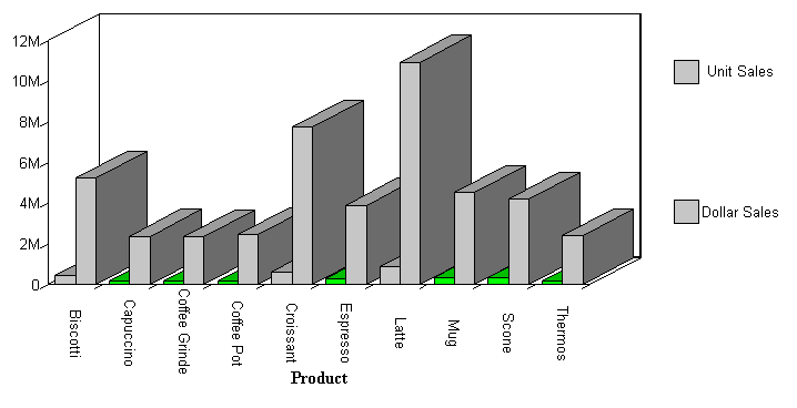 GRAPH FILE GGSALES SUM UNITS DOLLARS ACROSS PRODUCT ON GRAPH SET STYLE * TYPE=DATA,COLOR=SILVER,$ TYPE=DATA,ACROSSCOLUMN=N1,COLOR=LIME,WHEN=N1 LT 400000,FOCEXEC=GRAPH2,$ ENDSTYLE END