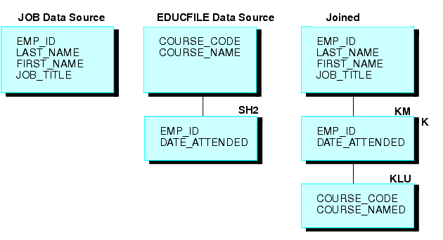 The JOB data source is organized by employee, but the EDUCFILE data source is organized by course. The data sources are joined on the EMP_ID field. Since an employee has one position but can attend several courses, the employee has one segment instance in the JOB data source but can have as many instances in the EDUCFILE data source as courses attended.