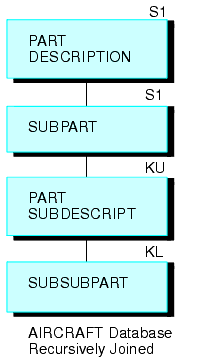 If you join the bottom segment to the top segment, the descriptions of component parts in the bottom segment can be retrieved. The first-level major divisions can also be related to third-level small parts, going from the first level to the second level to the third level. Thus, the structure behaves as a three-level data source, although it is actually a more efficient two-level source.
