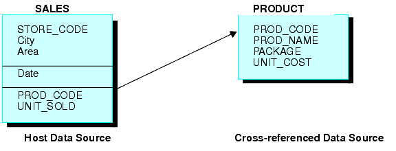 Consider the SALES and PRODUCT data sources. Each store record in SALES may contain many instances of the PROD_CODE field. It would be redundant to store the associated product information with each instance of the product code. Instead, PROD_CODE in the SALES data source is joined to PROD_CODE in the PRODUCT data source. PRODUCT contains a single instance of each product code and related product information, thus saving space and making it easier to maintain product information. The joined structure, which is an example of an equijoin, is illustrated below: