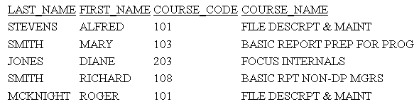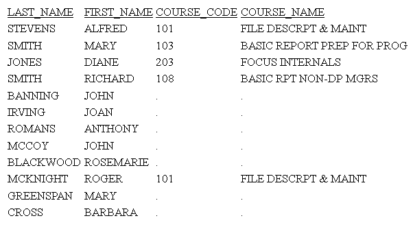 SET USER=USER2 SET DBAJOIN=OFF JOIN LEFT_OUTER EMP_ID IN EMPINFOSQL TO MULTIPLE EMP_ID IN EDINFOSQL AS J1 TABLE FILE EMPINFOSQL PRINT LAST_NAME FIRST_NAME COURSE_CODE COURSE_NAME ON TABLE SET PAGE NOPAGE ON TABLE SET STYLE * GRID=OFF,$ END