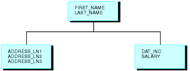 However, two employees, Davis and Gardner, are omitted from the following report because the LAST_NAME and FIRST_NAME fields belong to the root segment, and the DAT_INC and SALARY fields belong to the descendant salary history segment. Since Davis and Gardner have no descendant instances in the salary history segment, they are omitted from the report.