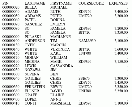 EMP_ID COURSE_CODE COURSE_NAME ------ ----------- ----------- 112847612 103 BASIC REPORT PREP FOR PROG 117593129 103 BASIC REPORT PREP FOR PROG 119265415 108 BASIC RPT NON-DP MGRS 119329144 . . 123764317 . . 126724188 . . 219984371 . . 326179357 102 BASIC REPORT PREP NON-PROG 543729165 . . 818692173 107 BASIC REPORT PREP DP MGRS