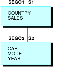 The following request contains two SUM commands. The first, SUM SALES BY COUNTRY, creates a segment with COUNTRY as the key and the summed values of SALES as a data field. The second, SUM SALES BY COUNTRY BY CAR BY MODEL, creates a descendant segment, with CAR and MODEL as the keys and SALES as a non-key field.