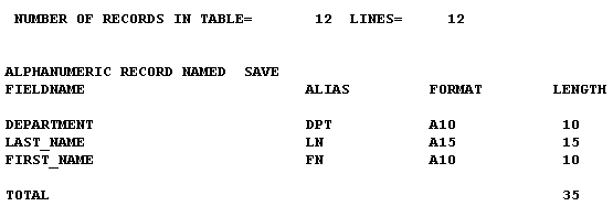 A description of the ALPHA (default SAVE format) file layout appears after the records are retrieved.