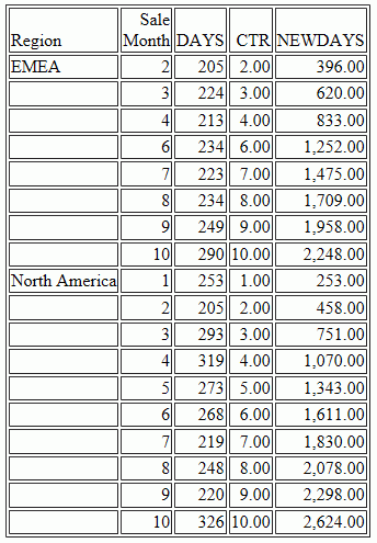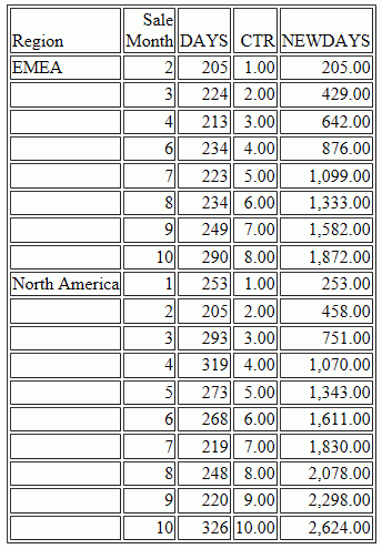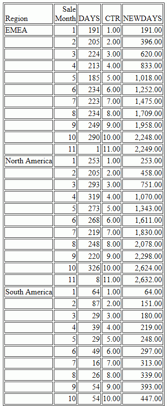 TABLE FILE WF_RETAIL_LITE SUM DAYSDELAYED AS DAYS COMPUTE CTR/I3 = IF BUSINESS_REGION EQ LAST BUSINESS_REGION THEN CTR+1 ELSE 1; COMPUTE NEWDAYS = IF BUSINESS_REGION EQ LAST BUSINESS_REGION THEN NEWDAYS+DAYSDELAYED ELSE DAYSDELAYED; BY BUSINESS_REGION AS Region BY TIME_MTH WHERE BUSINESS_REGION NE 'Oceania' ON TABLE SET PAGE NOPAGE END