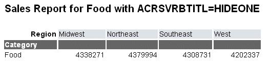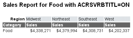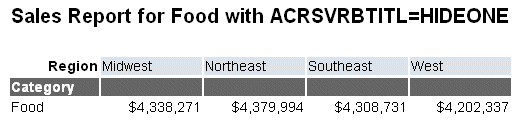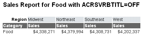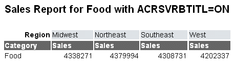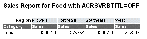 Using the default value for ACRSVRBTITL, HIDEONE, suppresses the ACROSS title Sales, even though the heading displays a field value that adds a report column to the internal matrix.
