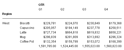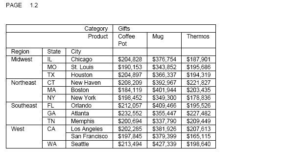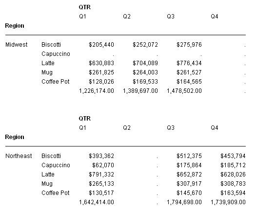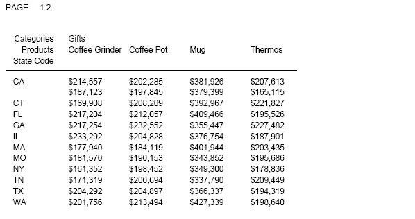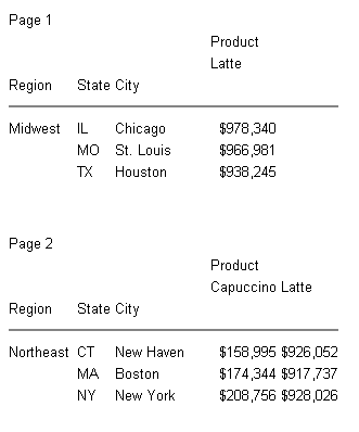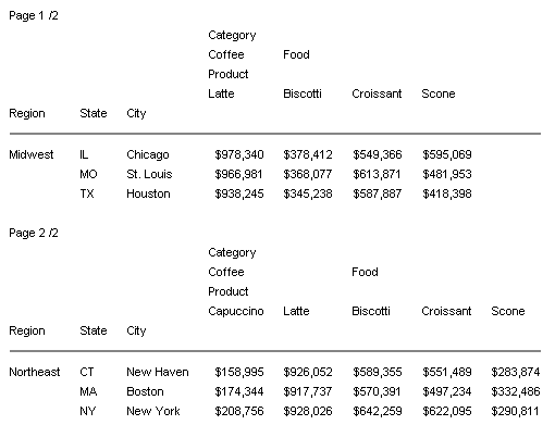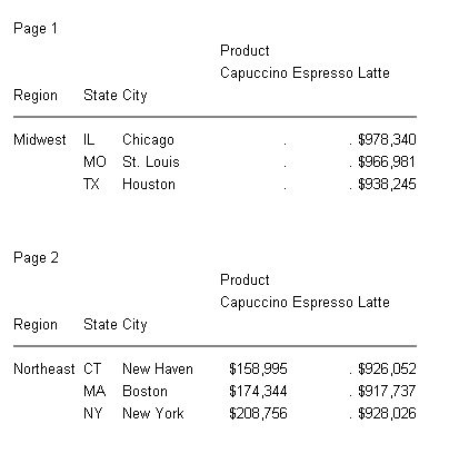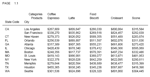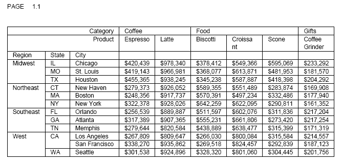 ENDThe ACROSS title Category displays to the left of the ACROSS values Coffee, Food, and Gifts. The ACROSS title Product displays to the left of the ACROSS values Espresso, Latte, Biscotti, and so on. The ACROSS titles are right-justified above the space occupied by the BY field names Region, State, and City. Notice that the ACROSS value Croissant wraps onto a second line, and the ACROSS title is aligned with the top line. The following shows panel 1: