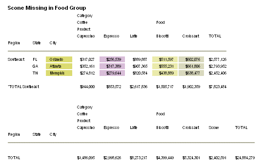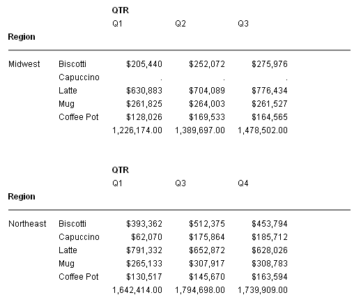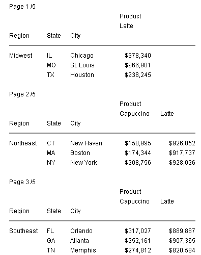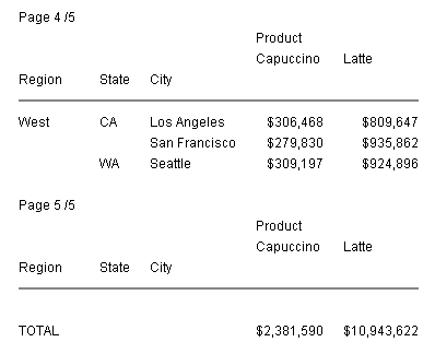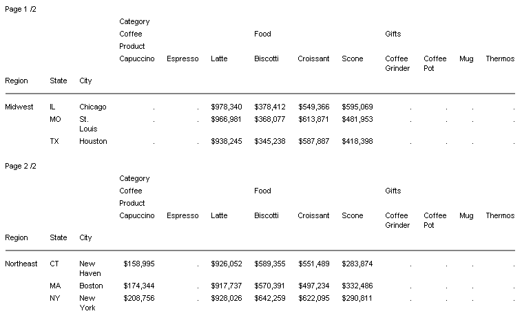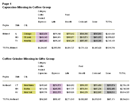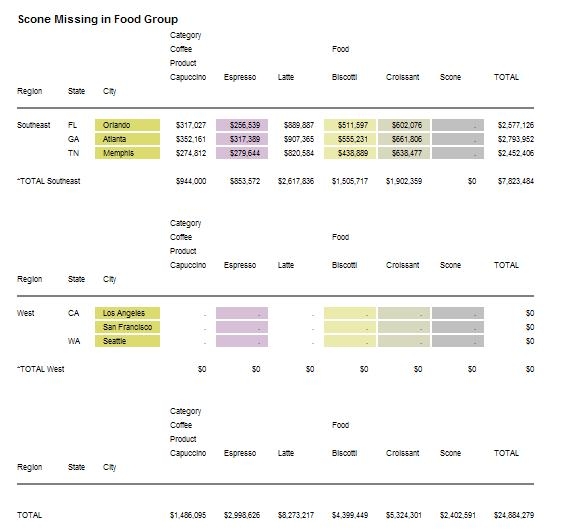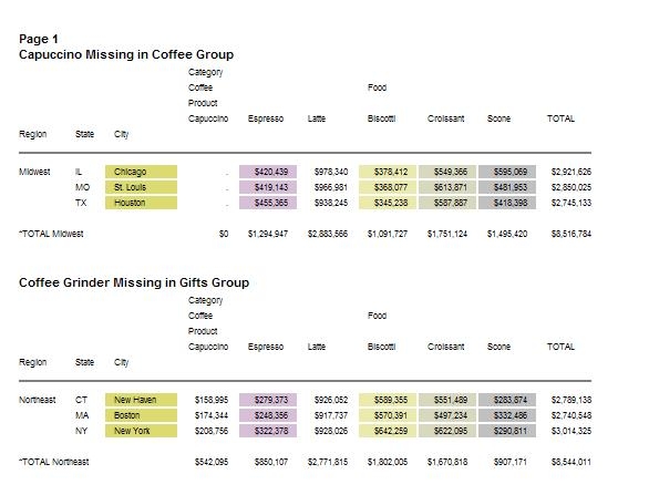 SET HIDENULLACRS=OFF DEFINE FILE GGSALES SHOWDOLLARS/I8M MISSING ON = IF ((PRODUCT EQ 'Capuccino' AND REGION EQ 'Midwest') OR (PRODUCT EQ 'Coffee Grinder' AND REGION EQ 'Northeast') OR (PRODUCT EQ 'Scone' AND REGION EQ 'Southeast') OR (REGION EQ 'West')) THEN MISSING ELSE DOLLARS; END TABLE FILE GGSALES SUM SHOWDOLLARS AS '' BY REGION BY ST BY CITY ACROSS CATEGORY ACROSS PRODUCT ON REGION SUBTOTAL AS '*TOTAL' ON REGION PAGE-BREAK HEADING " Page <TABPAGENO "HEADING " Capuccino Missing in Coffee Group " WHEN REGION EQ 'Midwest'; HEADING " Coffee Grinder Missing in Gifts Group " WHEN REGION EQ 'Northeast'; HEADING " Scone Missing in Food Group " WHEN REGION EQ 'Southeast'; WHERE CATEGORY EQ 'Coffee' OR 'Food' ON TABLE SET PAGE-NUM OFF ON TABLE SET BYPANEL ON ON TABLE ROW-TOTAL AS 'TOTAL' ON TABLE COLUMN-TOTAL AS 'TOTAL' ON TABLE SET HTMLCSS ON ON TABLE PCHOLD FORMAT HTML ON TABLE SET STYLE * UNITS=IN,PAGESIZE='Letter',SQUEEZE=ON,ORIENTATION=PORTRAIT,$ TYPE=REPORT,HEADPANEL=ON,GRID=OFF,FONT='ARIAL',SIZE=6,$ TYPE=HEADING, style=bold, size=8,$ TYPE=DATA, COLUMN = C5, BACKCOLOR=WHEAT,$ TYPE=DATA, COLUMN = P5, BACKCOLOR=THISTLE,$ TYPE=DATA, COLUMN = N7, BACKCOLOR=MEDIUM GOLDENROD,$ TYPE=DATA, COLUMN = B3, BACKCOLOR=GOLDENROD,$ TYPE=DATA, COLUMN = SHOWDOLLARS(6), BACKCOLOR=silver,$ ENDSTYLE END