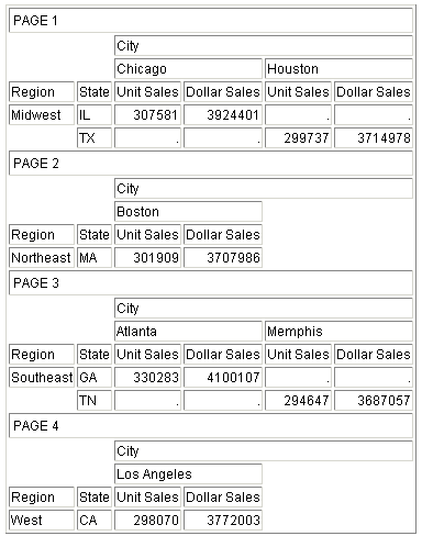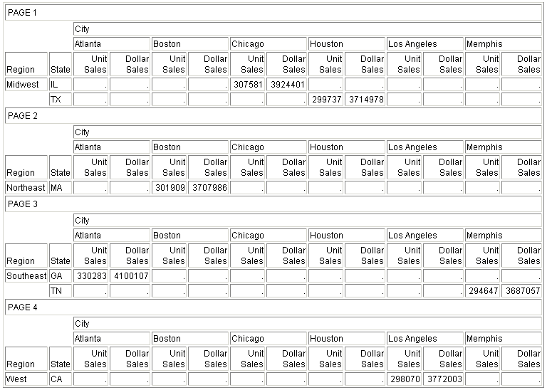 SET HIDENULLACRS=OFF TABLE FILE GGSALES SUM UNITS DOLLARS BY REGION PAGE-BREAK BY ST ACROSS CITY WHERE CITY LE 'Memphis' ON TABLE SET HTMLCSS ON ON TABLE PCHOLD FORMAT HTML ON TABLE SET STYLE * TYPE=REPORT, FONT=ARIAL, SIZE=9,$ ENDSTYLE END