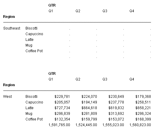 In the following request against the GGSALES data source, REGION is a BY field with a PAGE-BREAK, and PRODUCT is the ACROSS field. The DEFINE command creates a field named SHOWDOLLARS that has missing values for the Espresso column within the ACROSS group Coffee: